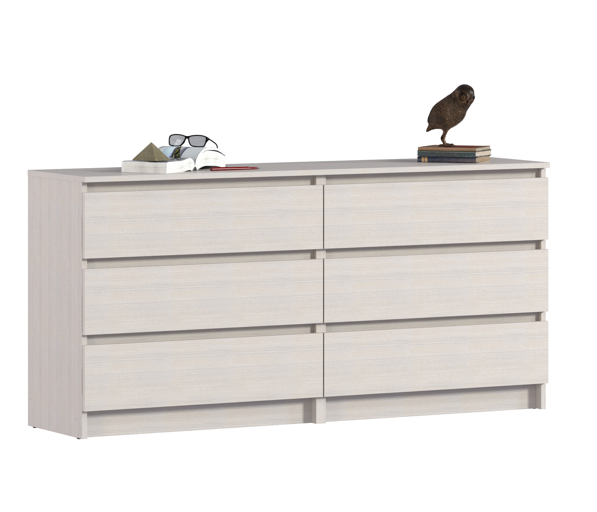 Комод с ящиками выполнен из ЛДСП: прочного и долговечного материала, который устойчив к механическим повреждениям. Мебель дополнена шестью вместительными ящиками, надежными механизмами открывания, а отсутствующие ручки делают модель более органичной и лаконичной.