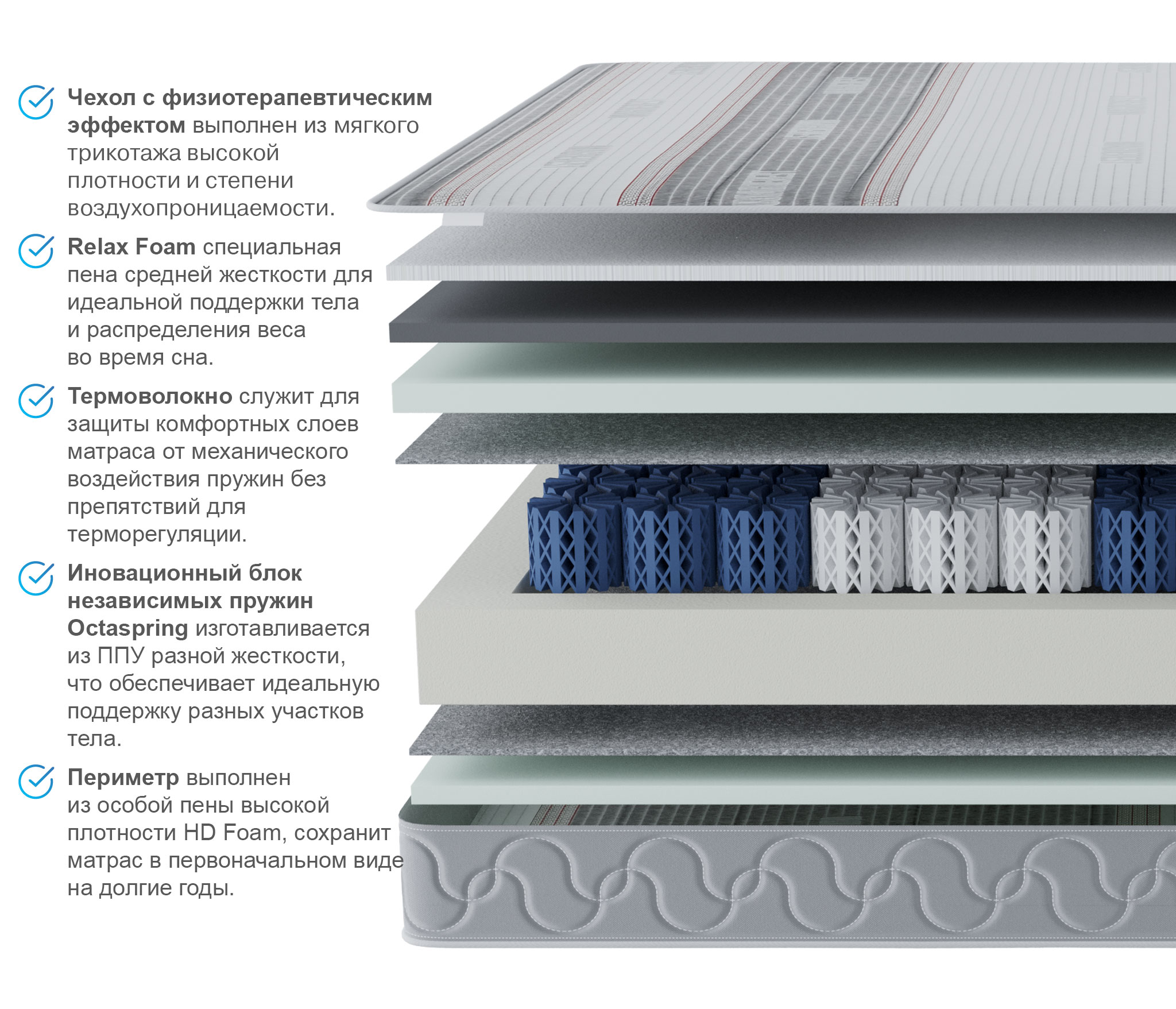 В основе матраса пенные пружины Octaspring высотой 10 см, что позволяет максимально ощутить мягкую динамичность пружины и ее индивидуальную работу. За счет этого увеличивается фаза глубокого сна и значительно снижаются нежелательные пробуждения, влияющие на восстановление организма.