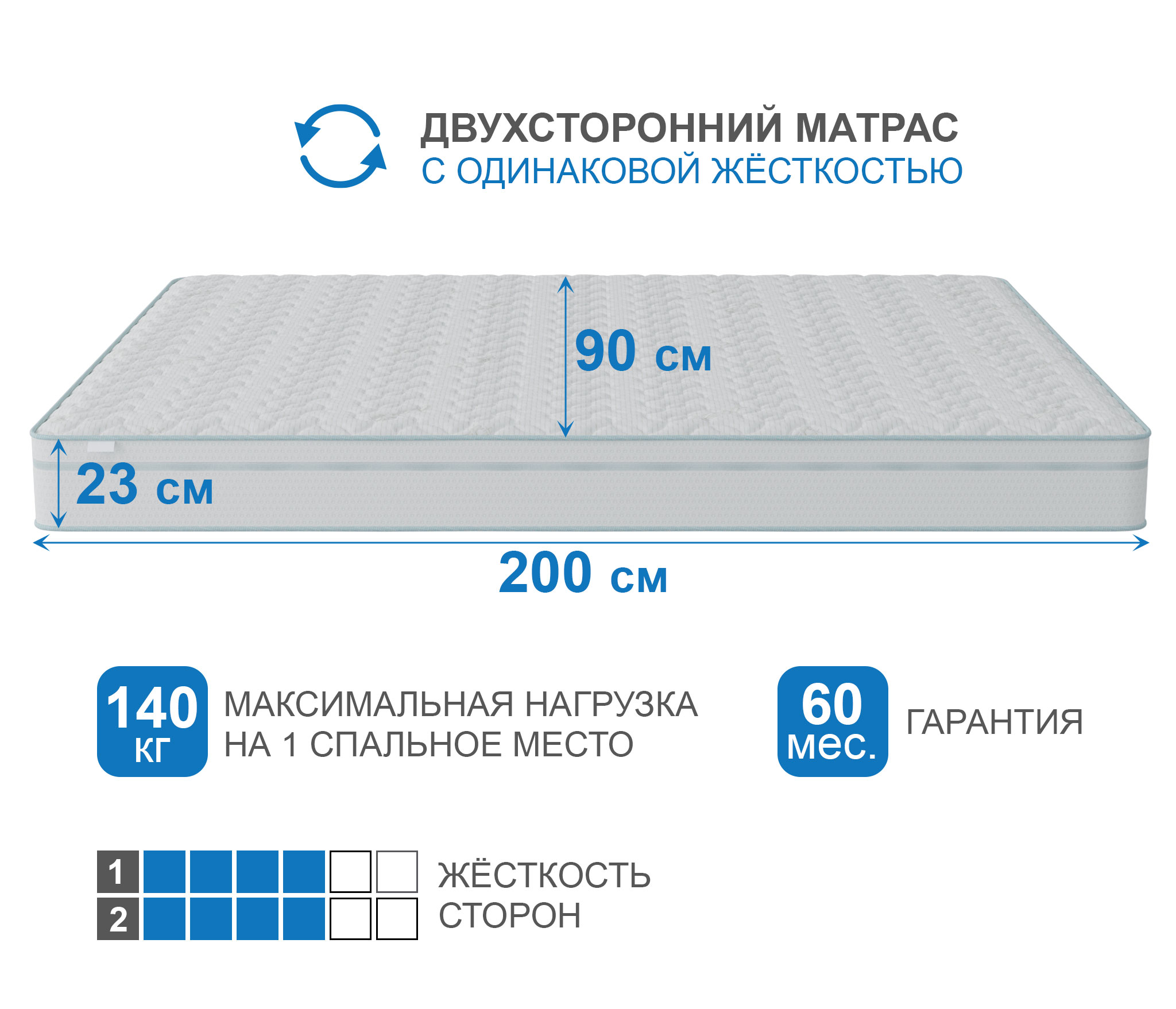 Этот матрас гарантирует оптимальную температуру для сна, на нем не будет холодно или жарко. Термогель, который входит в состав нити из которой делается одна из сторон матраса, гарантирует, что температура матраса будет ниже на 2 градуса цельсия, чем температура тела. Что опять же пойдет на пользу парам, которые не могут договориться о толщине одеяла или о том будет ли открыто окно на ночь. Для каждого температура будет оптимальной. Данное свойство не имеет срока годности и сохранится, даже в случае повреждения самой ткани матраса.В основе матраса лежит блок независимых пружин (мультипакет) 500 пр/м2, благодаря такой плотности пружин, матрас может повторять контуры спящего с максимальной точностью и при этом выдерживать довольно высокие нагрузки. Термовойлок защищает комфортные слои от истирания и соприкосновения с пружинами. В качестве комфортного слоя используется самая жесткая и прочная пена из существующих - (HL4065) толщиной 3 см.