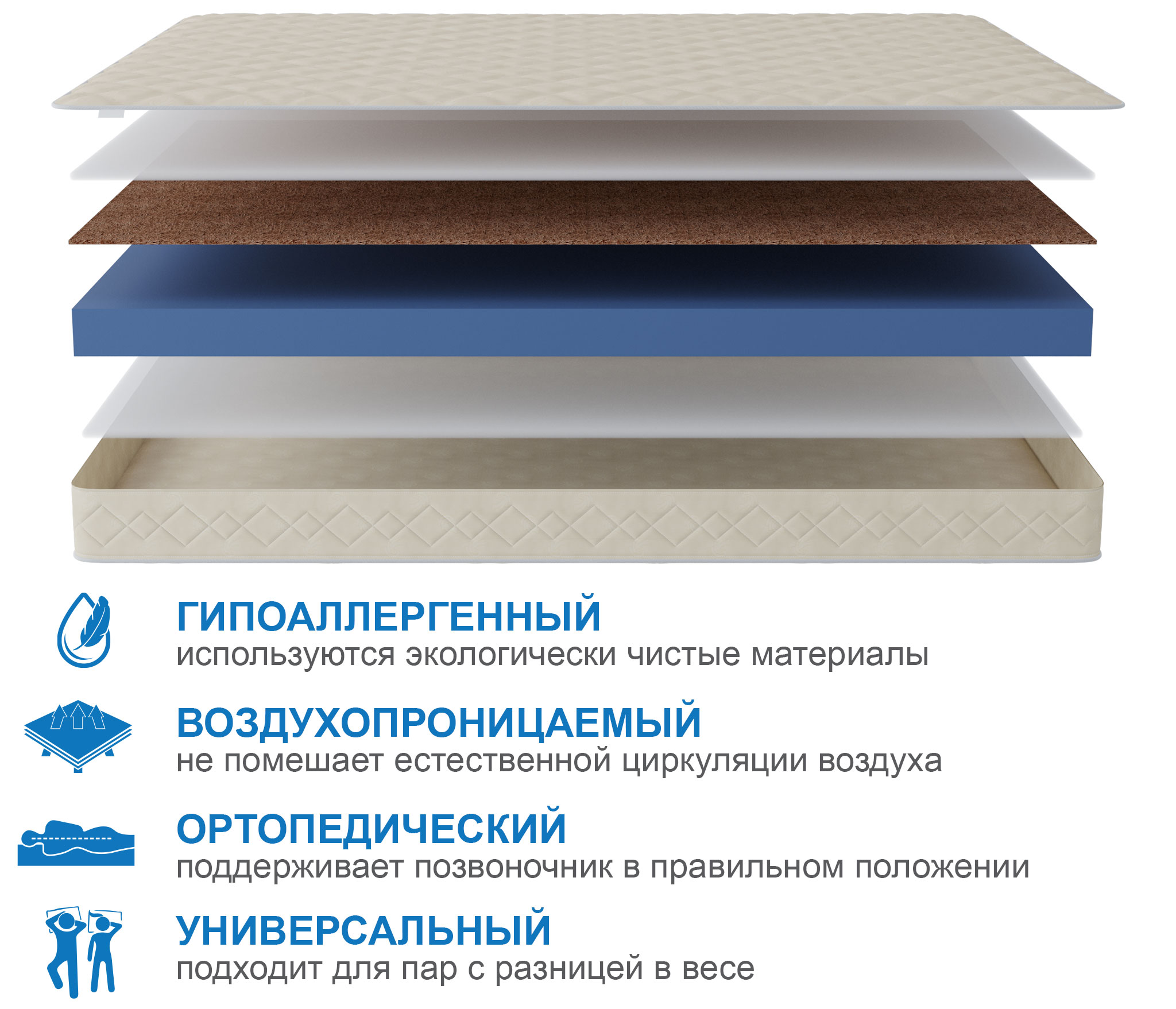 Отличный беспружинный матрас с разной степенью жесткости сторон. В качестве основы используется эластичная, но при этом довольно прочная и жесткая пена. Одна из сторон матрас дополнительно армирована листом латексированного кокоса, который придаст дополнительную прочность и жесткость. Матрас достаточно легкий и подходит для кроватей с подъемным механизмом, а так же для детских и молодежных кроватей с низким бортиком. При выборе матраса следует помнить о том, что любой матрас не отвечает за правильность положения головы и шеи, их здоровье зависит от правильно подобранной ортопедической подушки. Для увеличения срока службы матраса рекомендуется его использование с защитным чехлом AquaStop. |