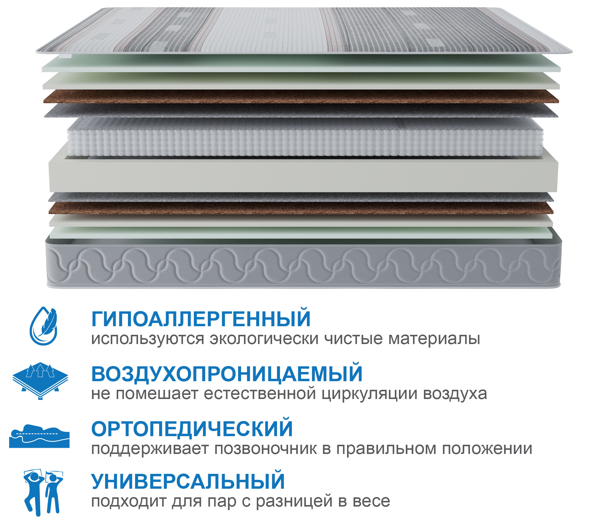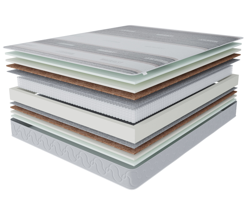 С обеих сторон матраса в качестве комфортного слоя используется 2 см искусственного латекса, этот материал очень долговечный и упругий, благодаря этому слою на этом матрасе будет одинаково комфортно людям разных весовых категорий. Для распределения нагрузки и придания необходимой жесткости используется латексированный кокосовый лист, который кладется под латекс. В основе матраса лежит блок независимых пружин, благодаря которому матрас будет индивидуально подстраиваться под каждого спящего и оказывать обратное давление только там, где это действительно необходимо. Чехол матраса сделан из плотного мягкого трикотажа, который стегается на 15 мм пене и синтепоне, что добавляет не много мягкости. Обращаем ваше внимание на то, что любой матрас отвечает за правильность положения во время сна нижнего и среднего отделов позвоночника, а за правильность положения шейного отдела отвечает правильно подобранная ортопедическая подушка. Рекомендуем использование с защитным чехлом AquaStop.