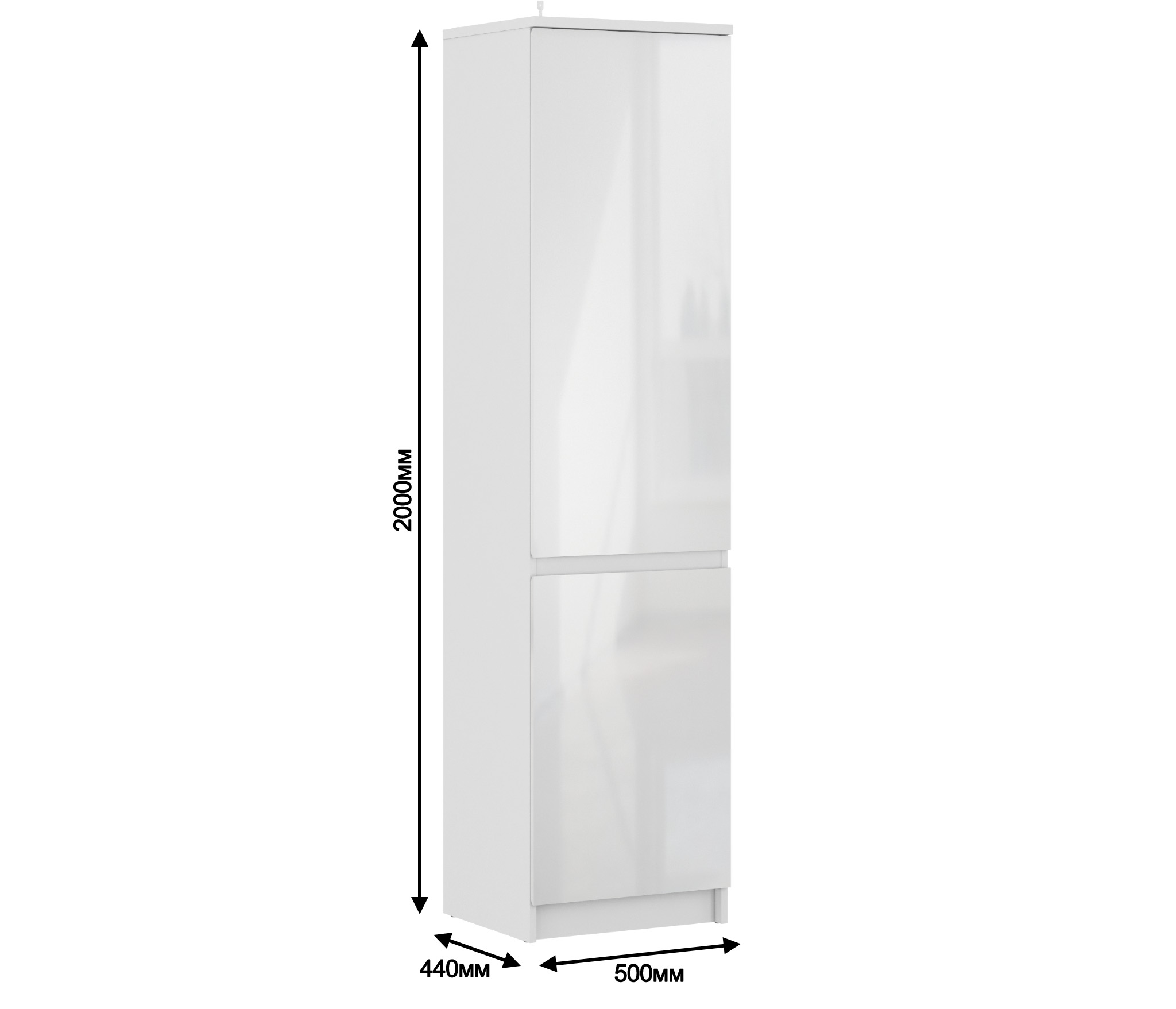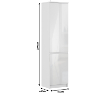 При скромных габаритах – ширина 50 см, высота 200 см, глубина 44, шкаф довольно вместителен. В нем два отделения, расположенных одно над другим, и у каждого своя дверца. В верхнем отделении три, а в нижнем две вместительные полки.¶Выполнен шкаф из прочного и современного материала КДСП и ЛДСП. Глянцевая отделка устойчива к влаге, что актуально для белого цвета. Шкаф имеет интегрированные в дверцы ручки. Он может использоваться как отдельный предмет мебели, так и в сочетании с другими элементами из коллекции Медея.