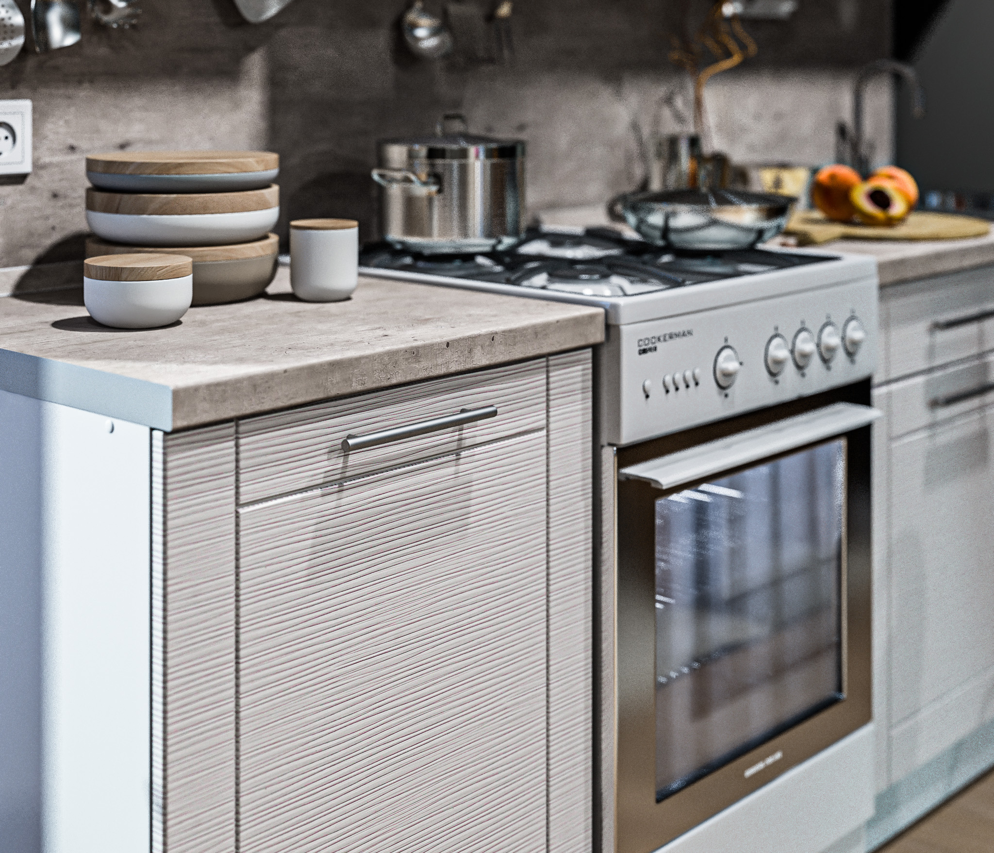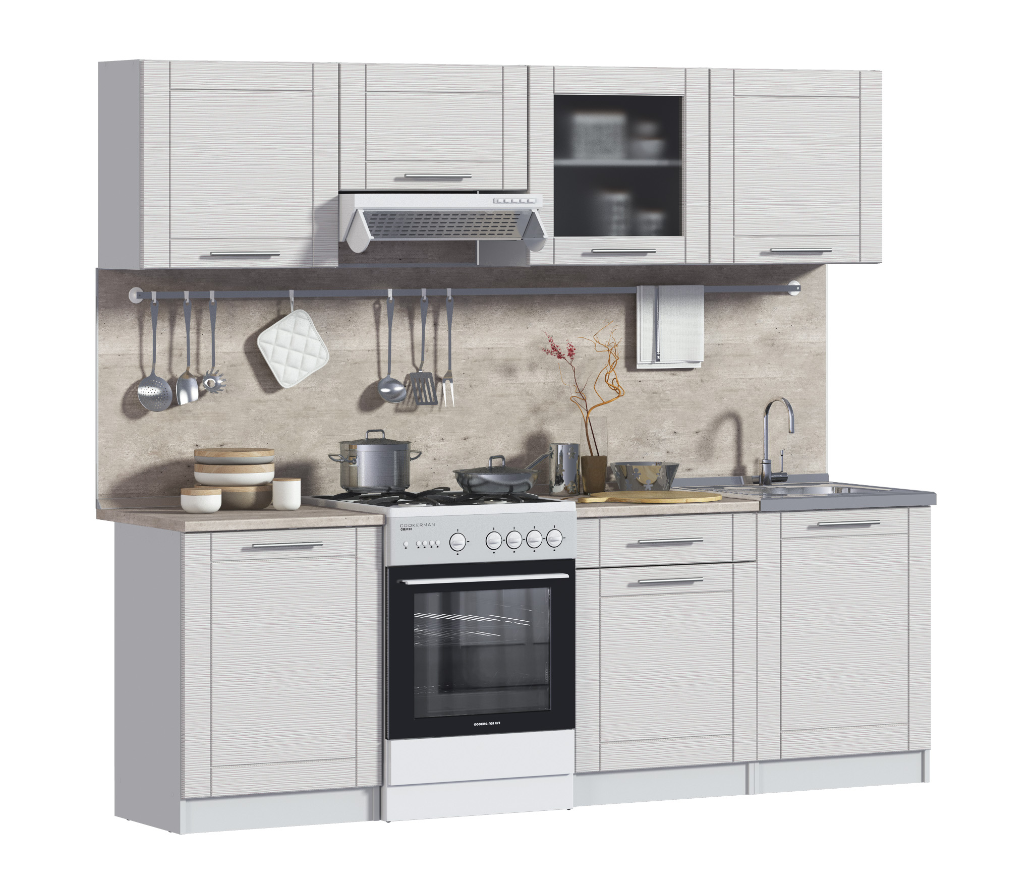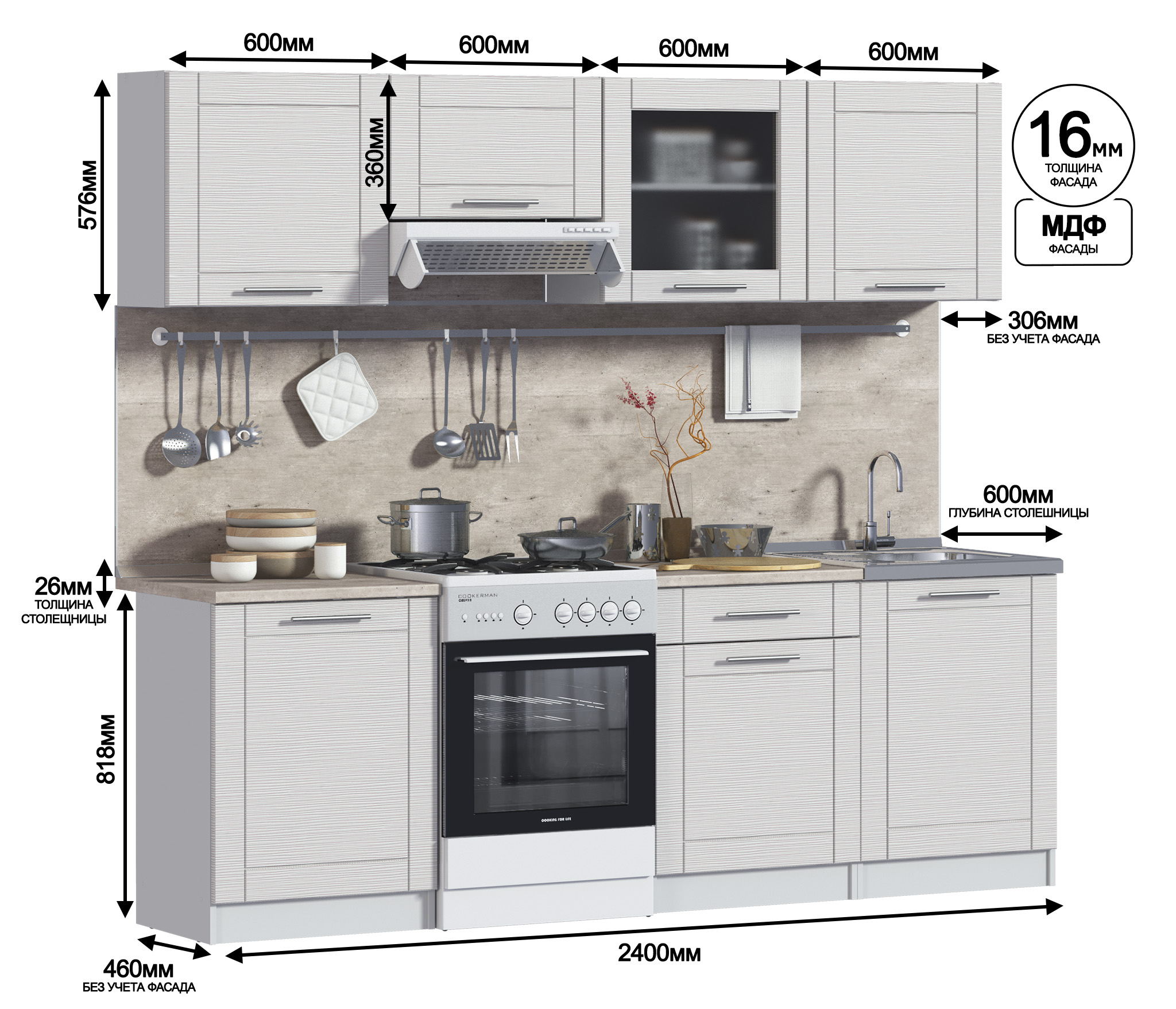 стеновую панель, аксессуары, бытовая техника, мойку и сушку для посуды.